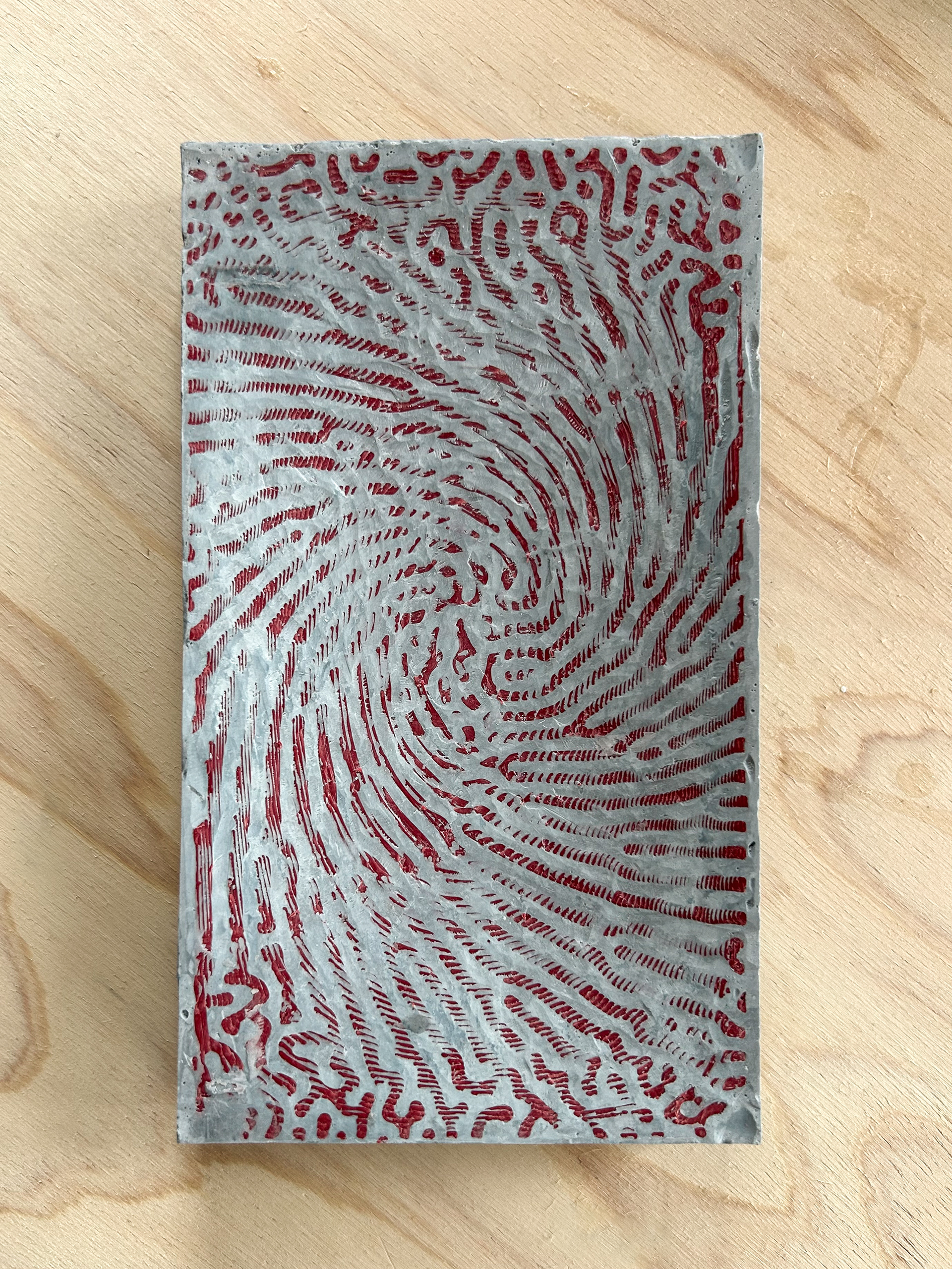 手法:3DPで紋様兼型を作成し、隙間にJesmoniteを埋め込んで表面の曲面形状を作成した。