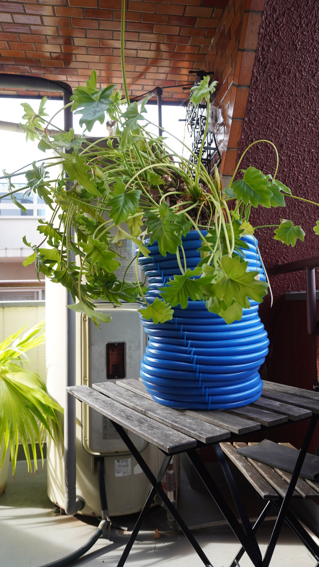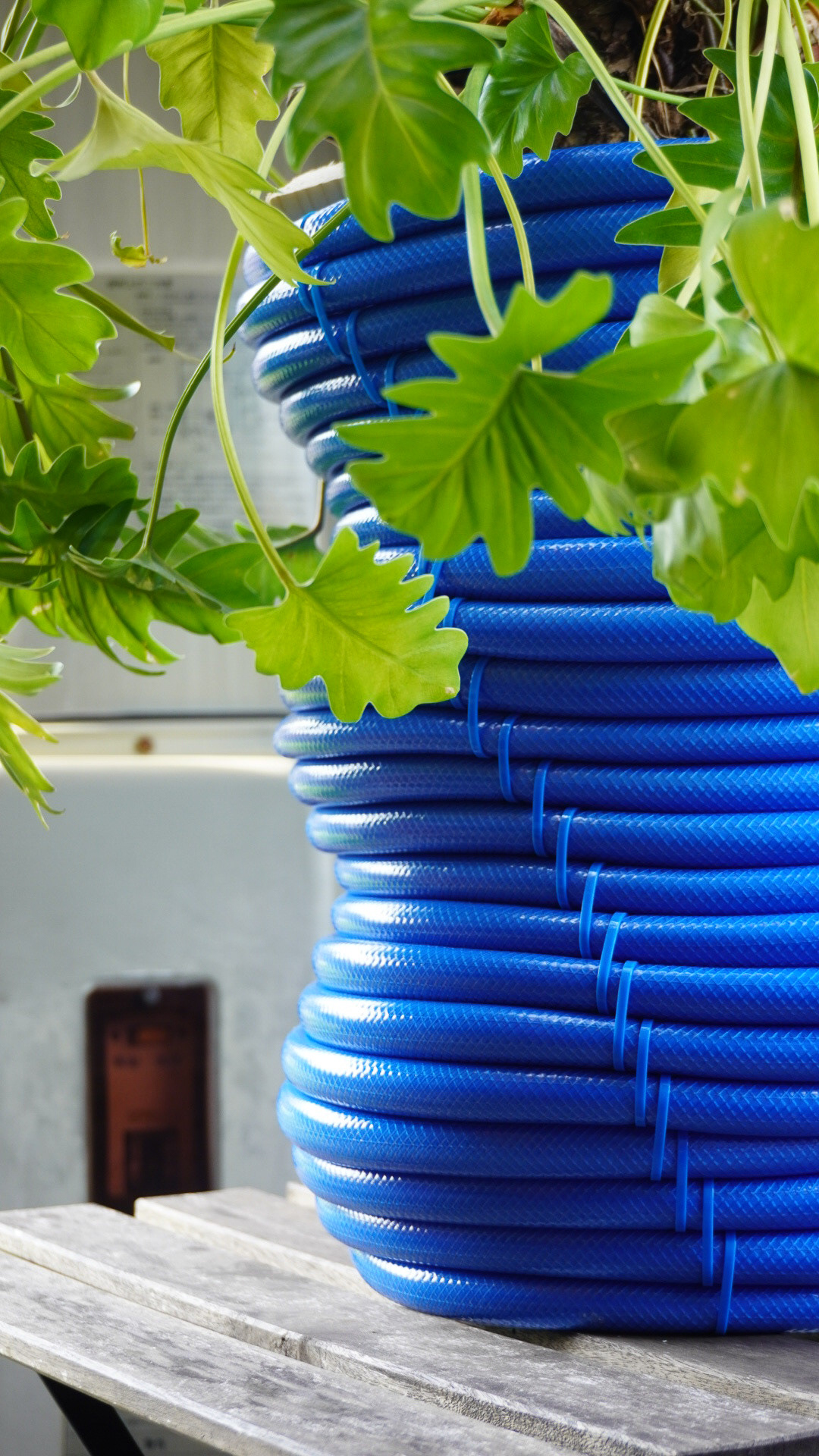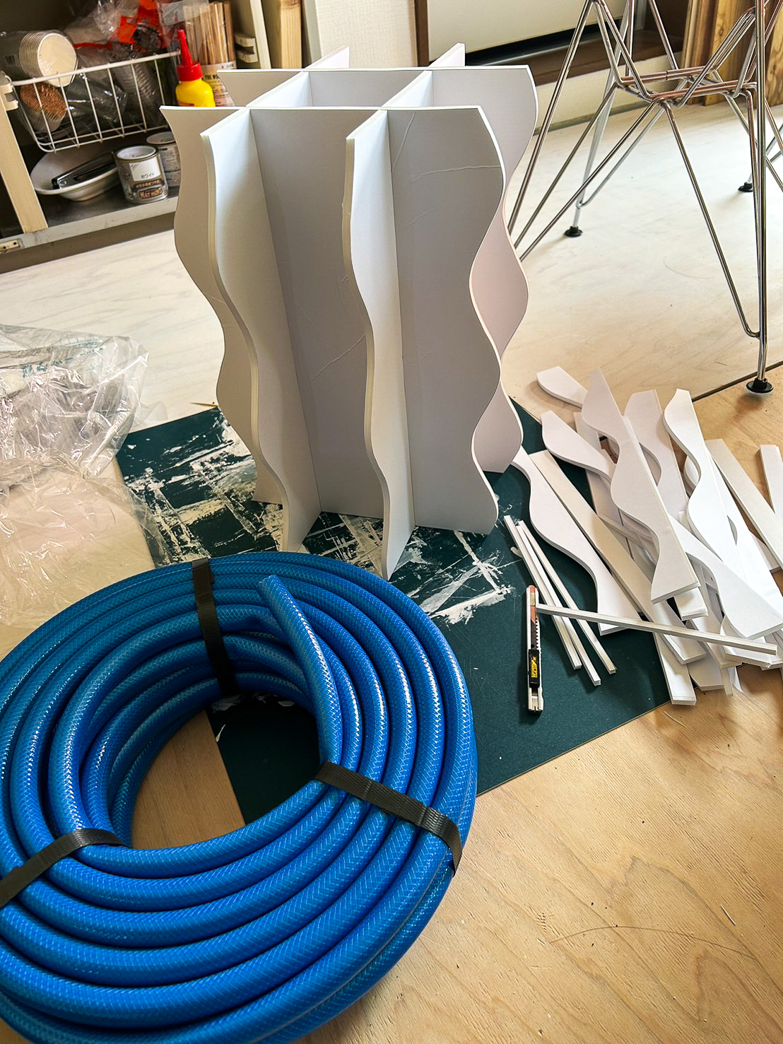 手法:ホースを結束バンドで固定しながら積層することで、園芸用をホースを幾何学的なシルエットのカバーへと変換した。